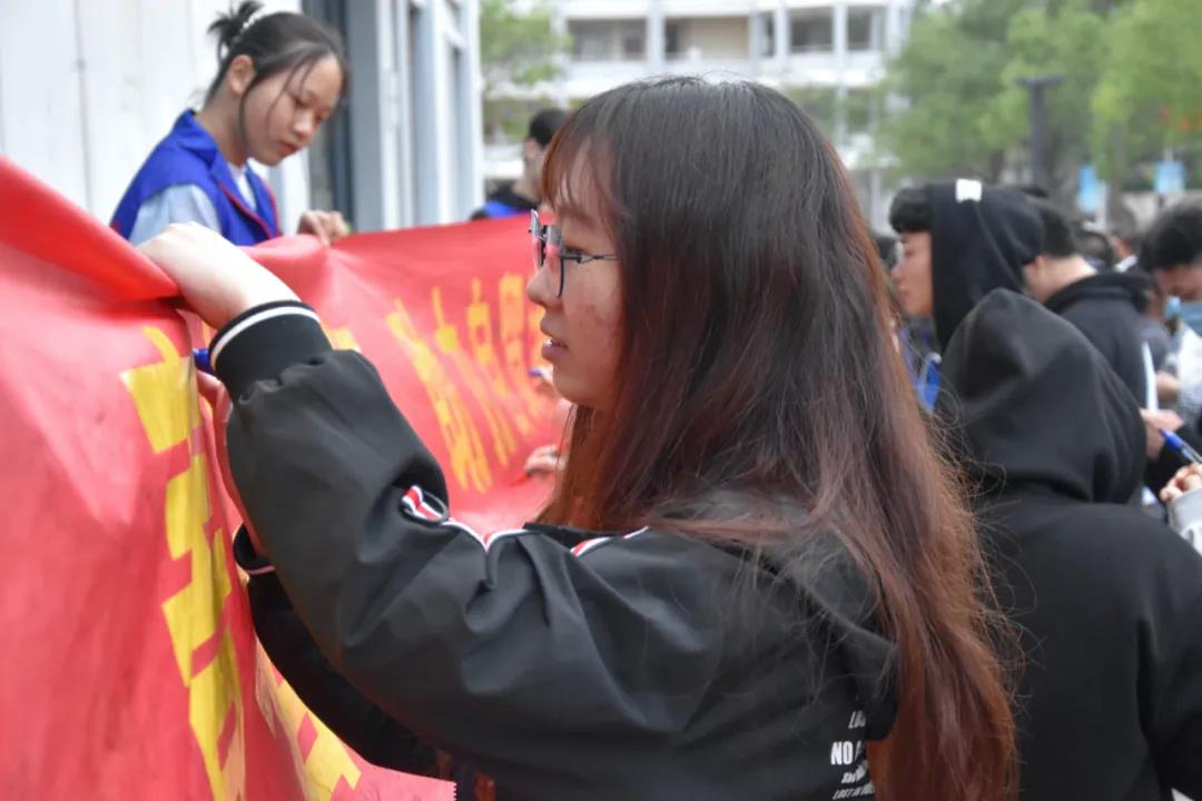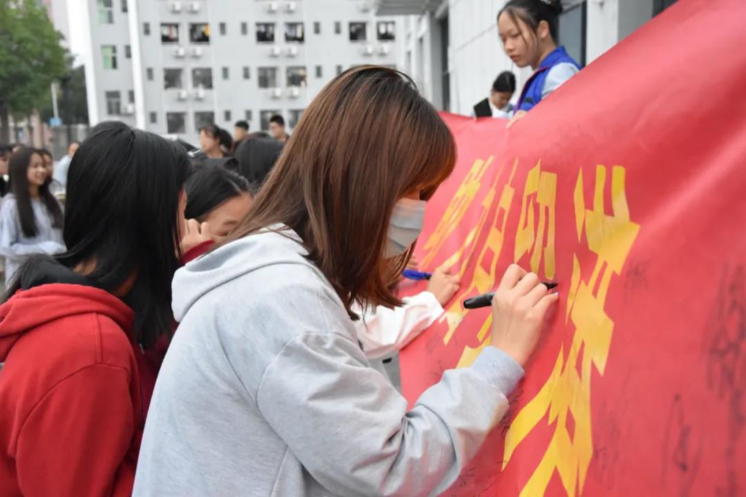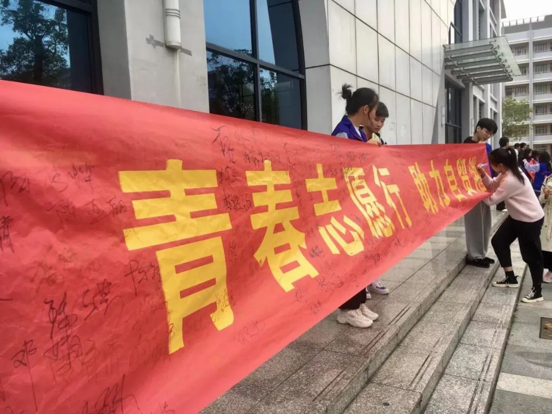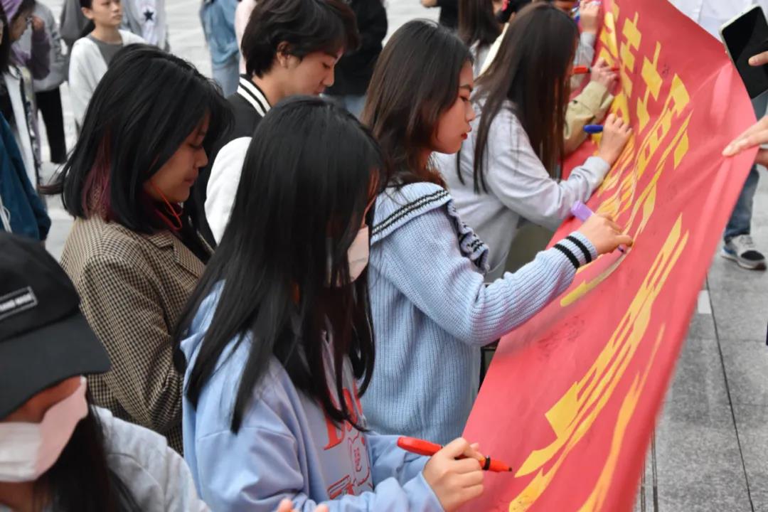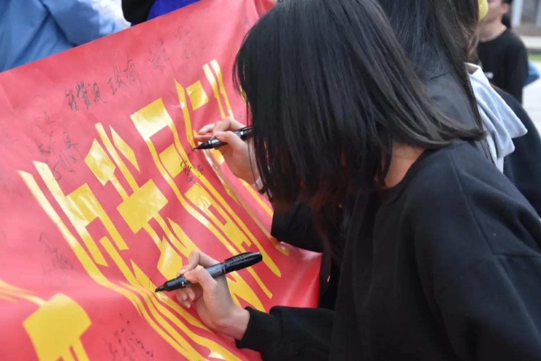 在体艺馆前,我院学生纷纷在横幅上签上了自己的名字,节约粮食是每一个人的义务与责任,我们以签字表决心,从此刻开始,在自身坚持光盘行动的同时,也会监督身边每一位同学,美好“食”光,我们同行。