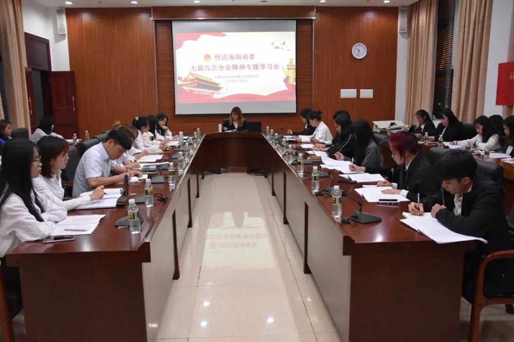会议伊始,陈伊媛同学宣读海南省委七届九次全会精神并带领大家学习海南省委七届九次全会精神专题。