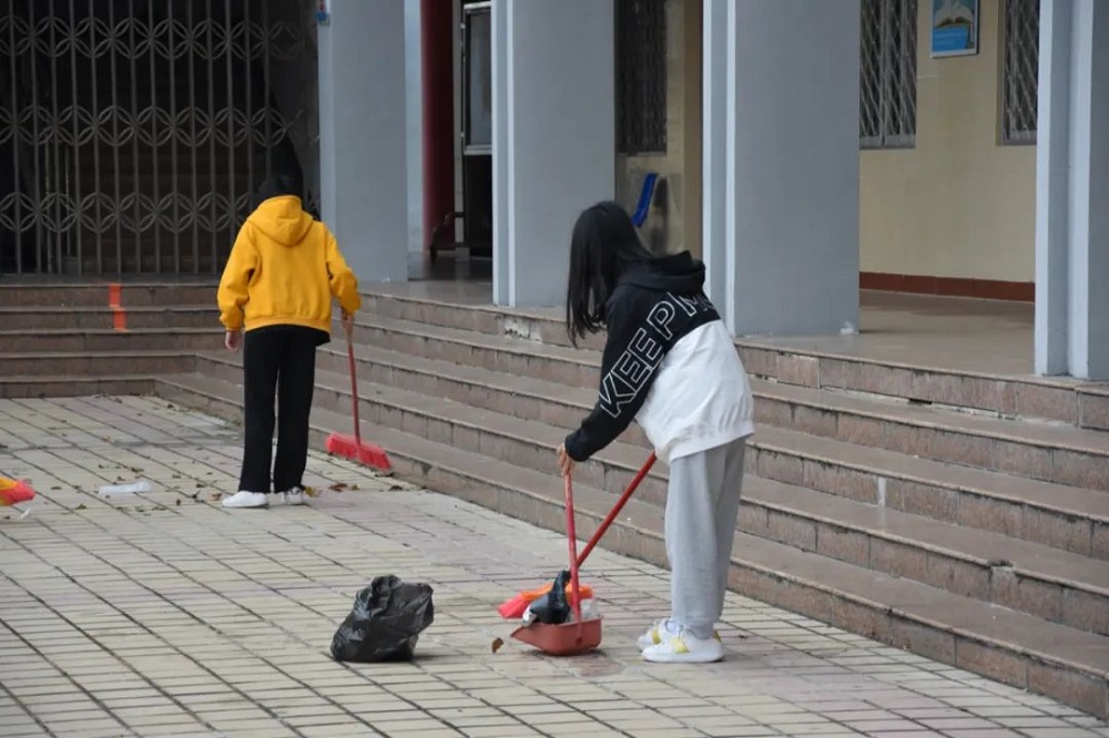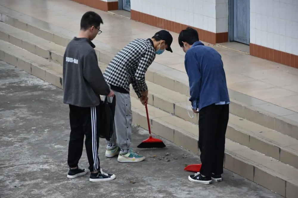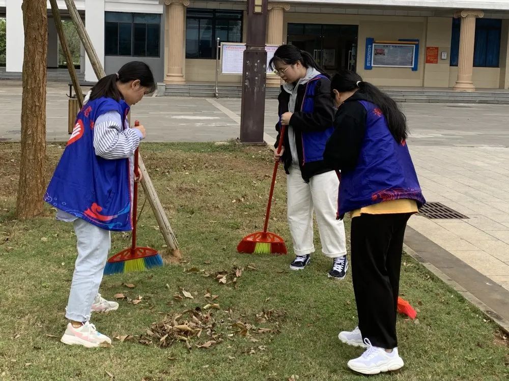 校园内18名学生干部清扫综合楼前的草地及走廊,用扫帚堆起沉积的落叶,用簸箕传递杂物。很快,在大家的齐心协力下草地及走廊焕然一新。同学们在互帮互助中感受集体的力量,良好的精神风貌为寒冷的冬天增添了一份温暖!