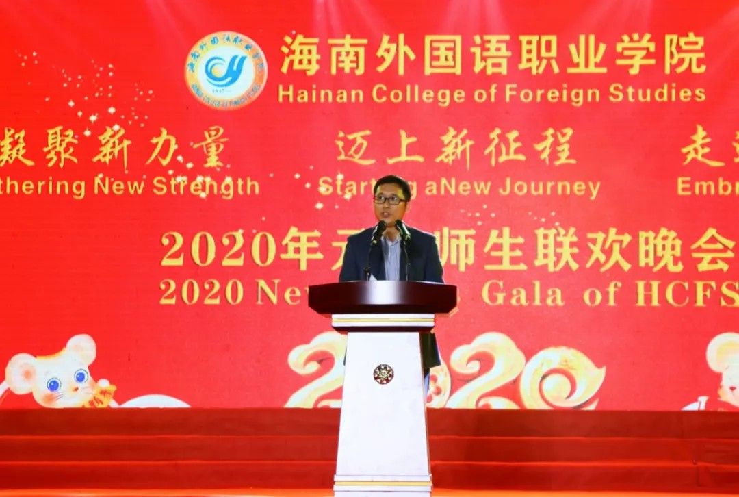 院党委书记曾锋、院长李渝凤、副院长杨学前、党委委员梁松、学院原党委书记韩祝畴、原党委副书记莫运深两位老领导一同来到现场与全体师生带着对新的一年的美好期盼欢聚一堂,共度良宵,祝福和迎接更加美好的2020年。