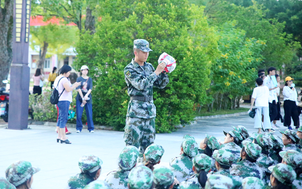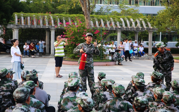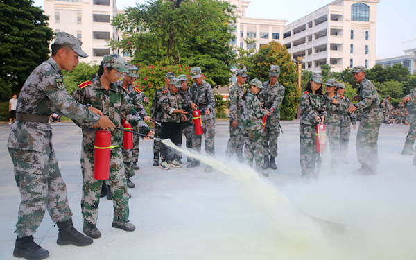 在消防疏散演练和消防技能展示中,军训教官先给新生们讲解突发火灾时,如何正确逃生和注意事项。随即进行疏散演练,新生们先在各个楼层待命,教官的哨声一响,同学们便按照教官的指示有序的逃离模拟现场。在消防技能展示环节,教官先向同学们讲解自救呼吸器和灭火器的使用方法,并进行示范,讲解动作要领,随后邀请同学们进行操作演练。在灭火的过程中,同学们毫不畏惧地提起灭火器按要求将火扑灭。