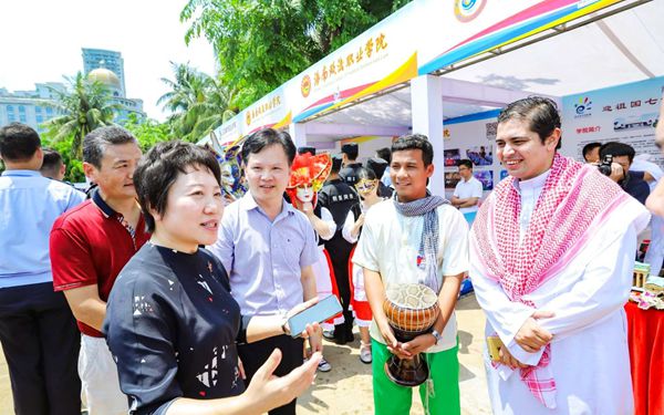 活动现场,来自我院东语系、西语系的师生,身着马来西亚、柬埔寨、法国等国家的特色服饰,与现场群众进行友好交流,还展示了各国风味美食,吸引了其他兄弟院校的师生和市民前来品尝,并称赞不绝。除此之外,我院柬埔寨留学生还表演了柬埔寨的特色舞蹈,吸引了市民纷纷拿出手机拍照记录精彩的表演。为将我院办学特色和优势展现出来,我院师生们恪尽职守坚守岗位,热情地告诉前来参观的师生他们手中美食的名字及哪个国家,并认真解答他们提出的问题。市民在与我院外籍教师交流时,尽管语言的表达有限,但也抵挡不住他们的热情,大家交流热烈,氛围融洽。