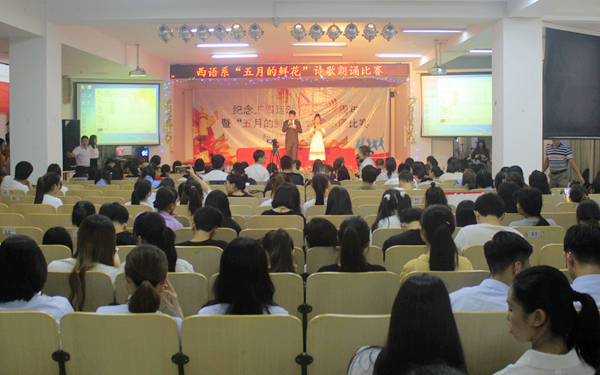 为贯彻落实习近平总书记对青年的殷切希望,继承五四光荣传统,弘扬“五四”爱国精神,5月9日下午,我院西语系在图书馆多功能报告厅举办“五月的鲜花”诗歌朗诵比赛,纪念五四运动100周年。西语系党总支书记李南群、主任高凤兰教授,以及团总支、学生科负责人、广大师生参加活动。