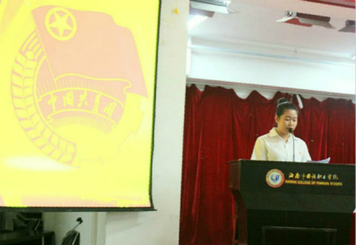颁奖仪式结束后,五四“优秀共青团员”代表梁信沂同学、五四“优秀共青团干部”代表郑雅芳同学、五四红旗团支部代表13(11)班团支书王靖同学、五四“红旗团总支”代表应用英语系潘立鹏老师先后上台发言,回顾了工作历程,表达了今后更加努力学习和工作,为学院发展做出更大贡献的决心。