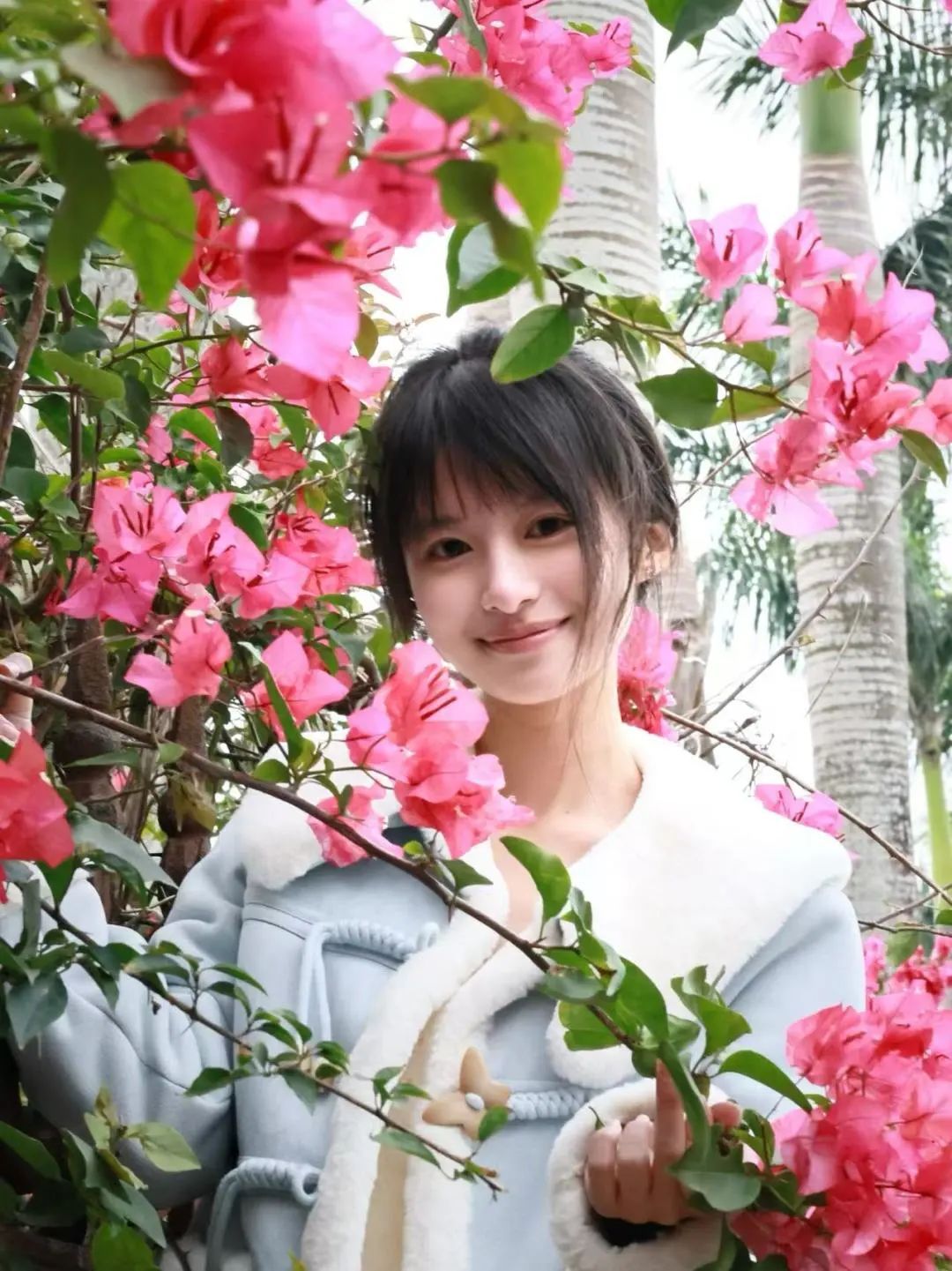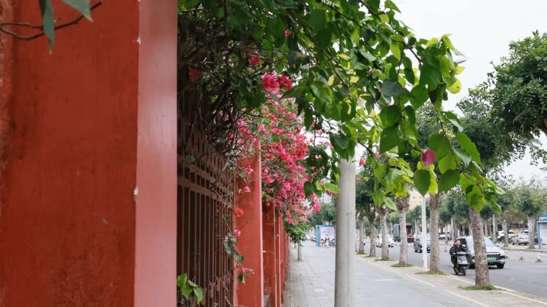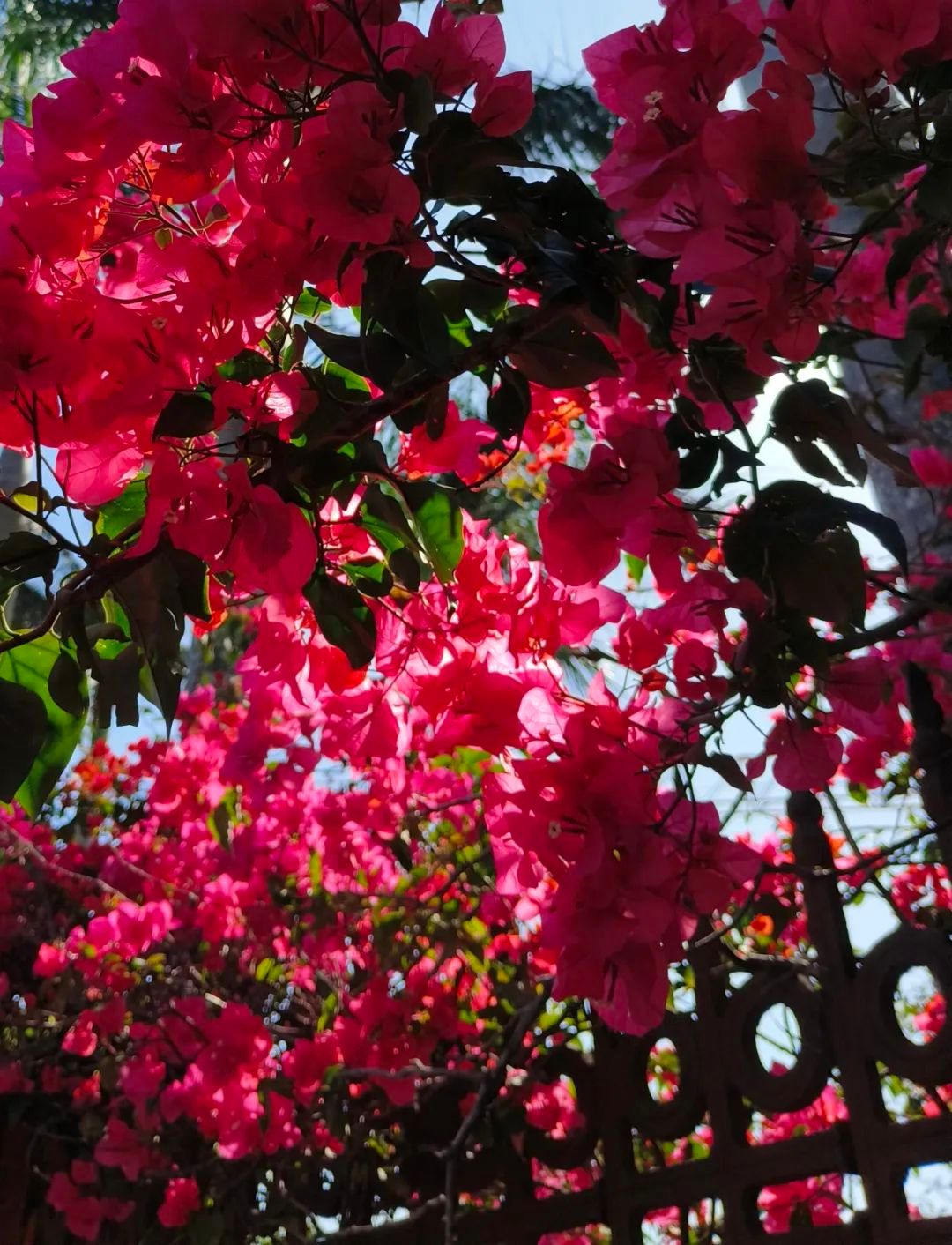 在学校东门处,铁栅栏的锈迹正啃噬暮色,锈色在衣角留下了印记。三角梅正以朝霞的姿势肆意流淌,为这原本沉默的阴天染上明快的色彩。绛紫花簇是淬火的釉,每片薄瓣都染着余晖勾勒的浓彩,在阴云浸泡下愈发浓稠。枝条在练化的赤铁沿栏杆缝隙垂落,整片荆棘便簌簌剥落铁屑——直到某簇花枝突然被风掀开褶皱。
