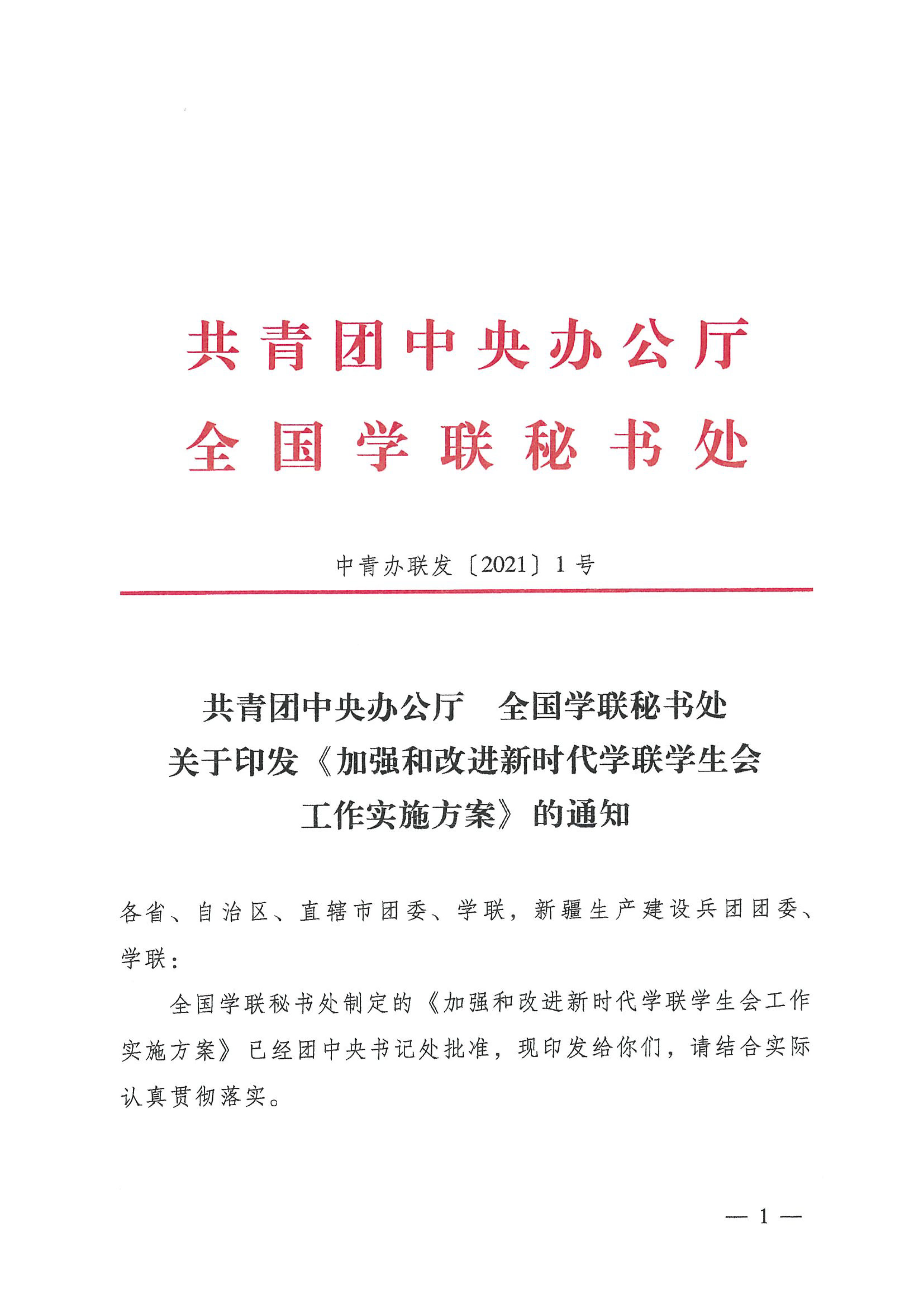 共青团中央办公厅 全国学联秘书处关于印发《加强和改进新时代学联学生会工作实施方案》的通知