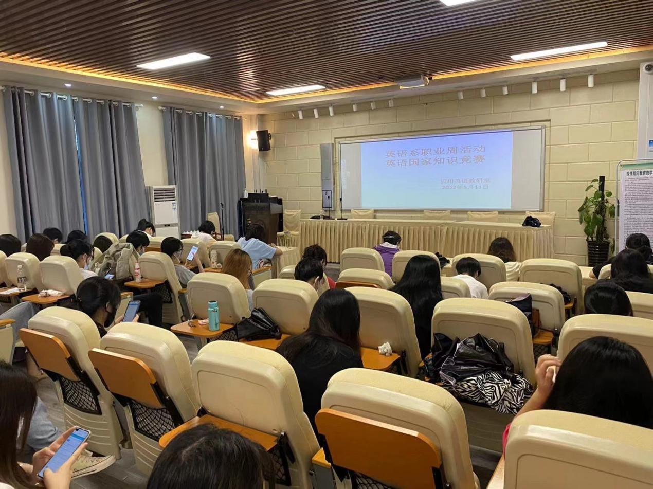 为了提高我系学生的英语学习兴趣,扩大学生的英语知识面,丰富学生的英语学习生活,培养学生的竞争意识和进取精神,从而让学生快乐地学习英语,2022511日,由英语系应用英语教研室举办的英语国家知识竞赛AE101AE102多媒体教室举行,20应用英语(1-4)班,18应用英语(501)班共计5个班的学生参加了本次竞赛。