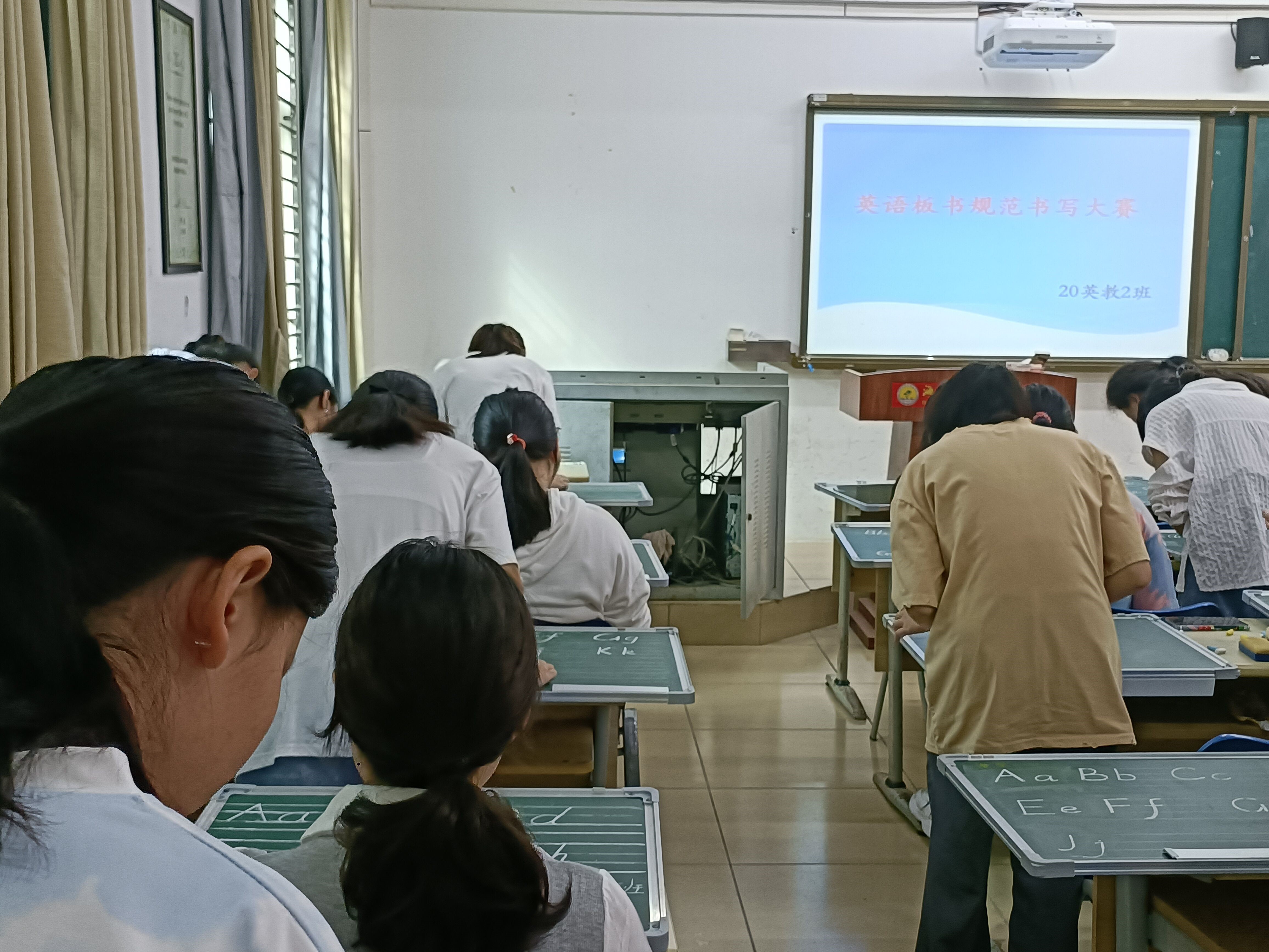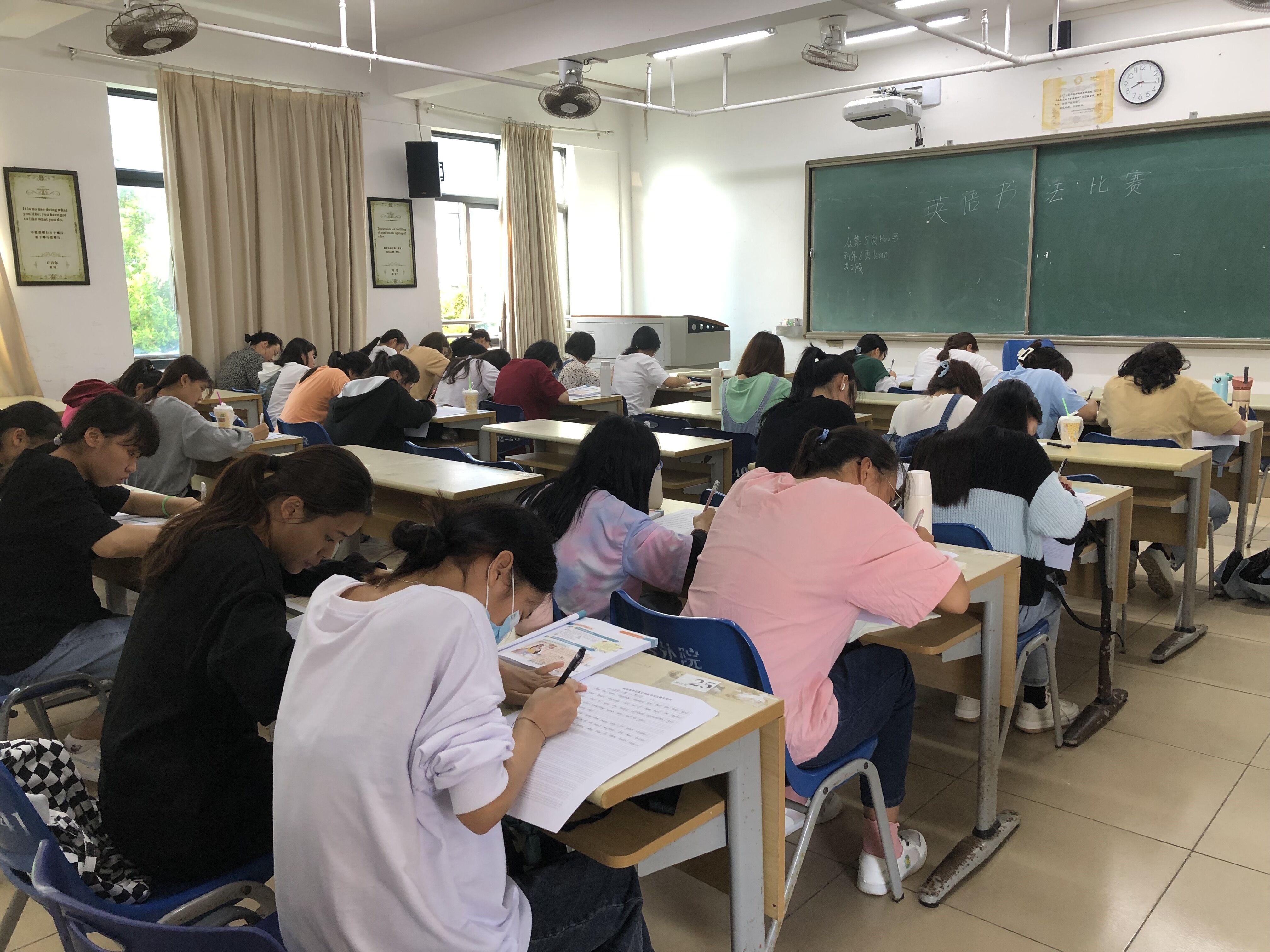 一眼望去,参加比赛的同学们一个比一个认真。他们都在为第一名而努力地书写着,他们书写的不仅仅是英文字母,而是自己的辛苦努力和坚持练习。