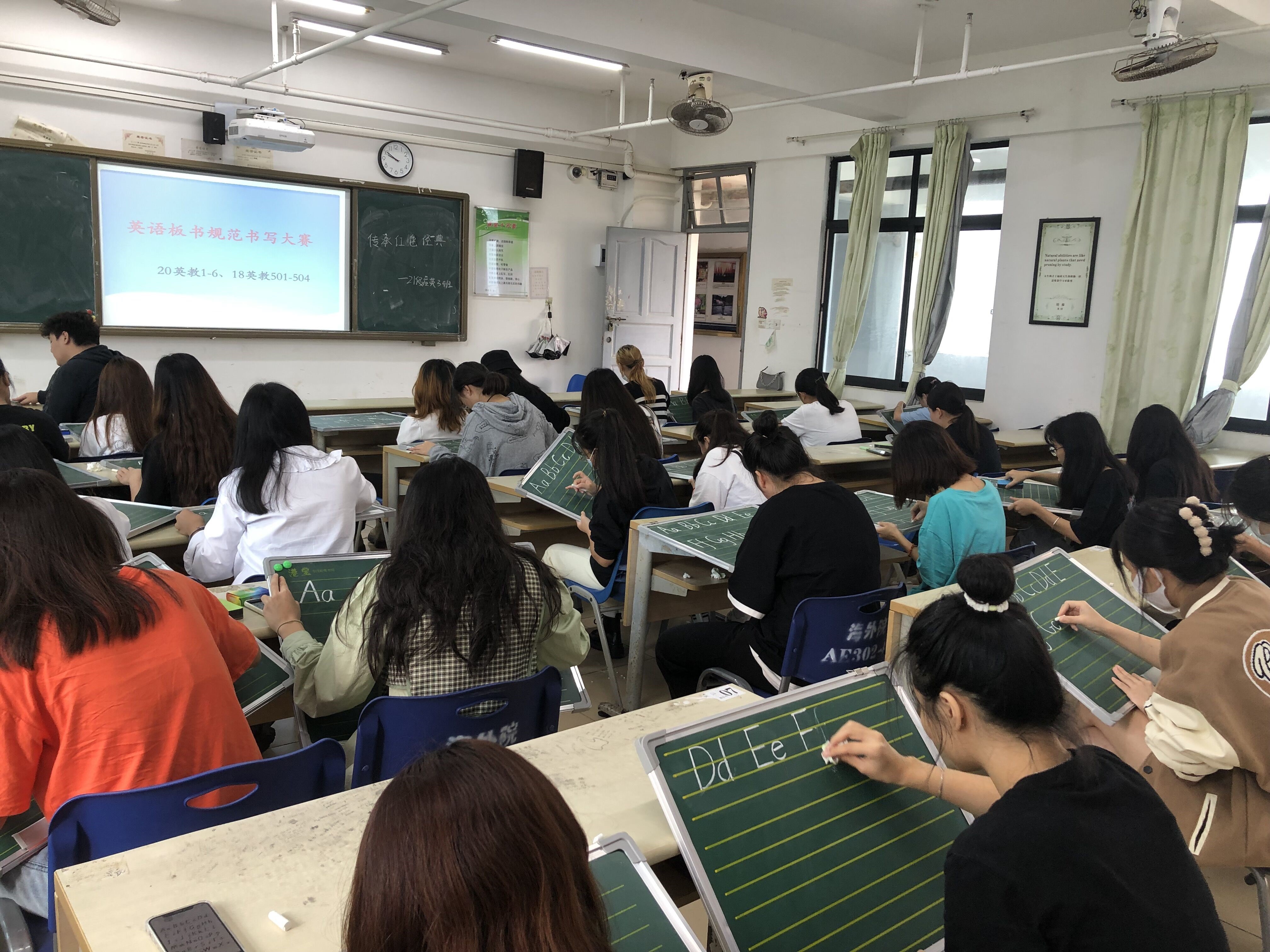 了丰富校园文化生活,营造良好英语学习氛围,充分激发我系学生的英语学习兴趣,提高同学们的英语书写能力,为将来的职业发展做好充分准备。冬季小学期期间,英语系英语教育教研室在20211117日和19日分别对21英教1-6班和20英教1-6班、18英教501-504班开展了英语粉笔规范板书和钢笔规范书写系列比赛。同学们积极参与了比赛,在英语书写中创造美、感受美。