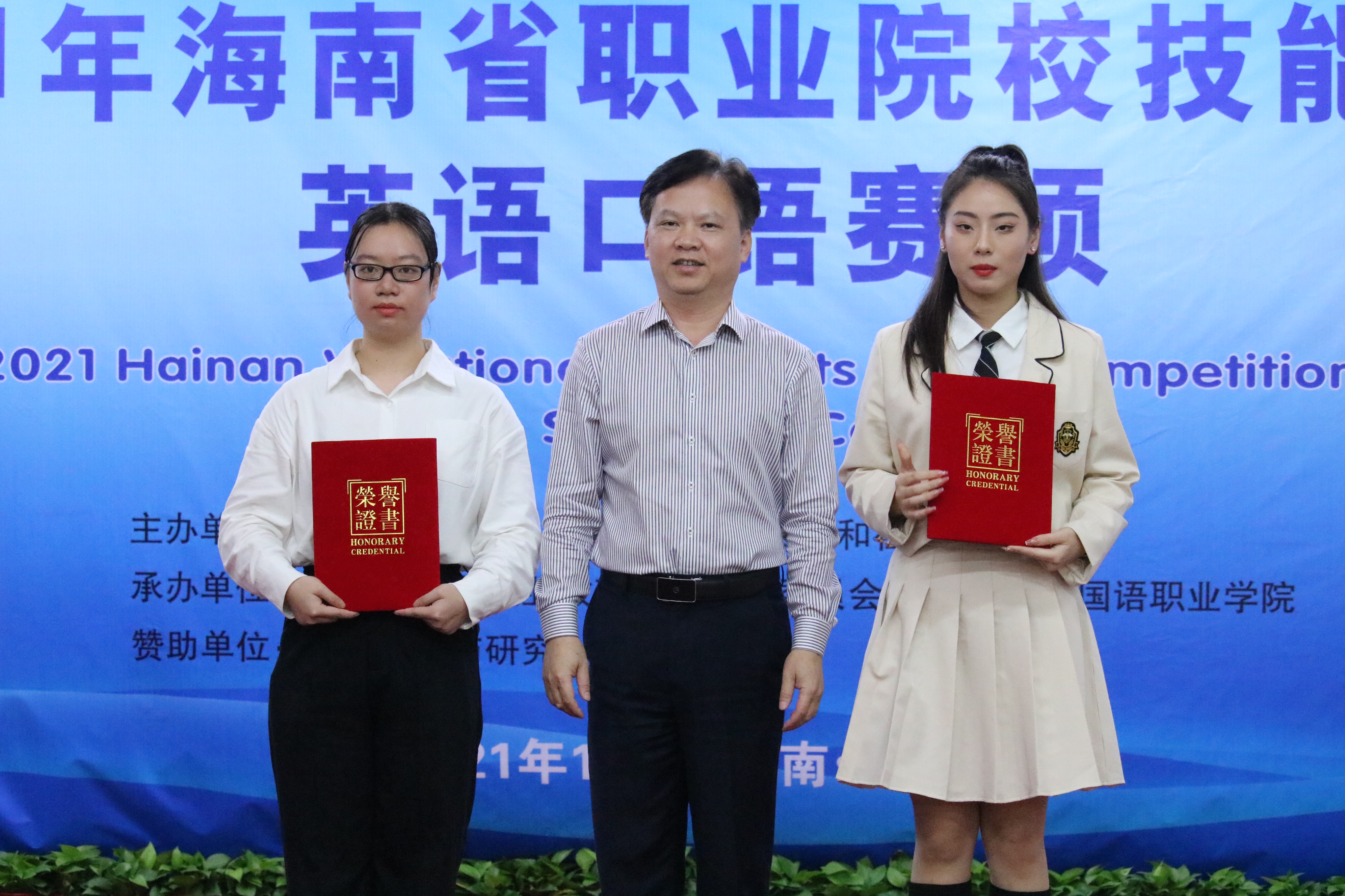 △海南省外语职业教育教学指导委员会主任,我院党委副书记、院长杨学前教授为获得金奖的两位同学颁奖