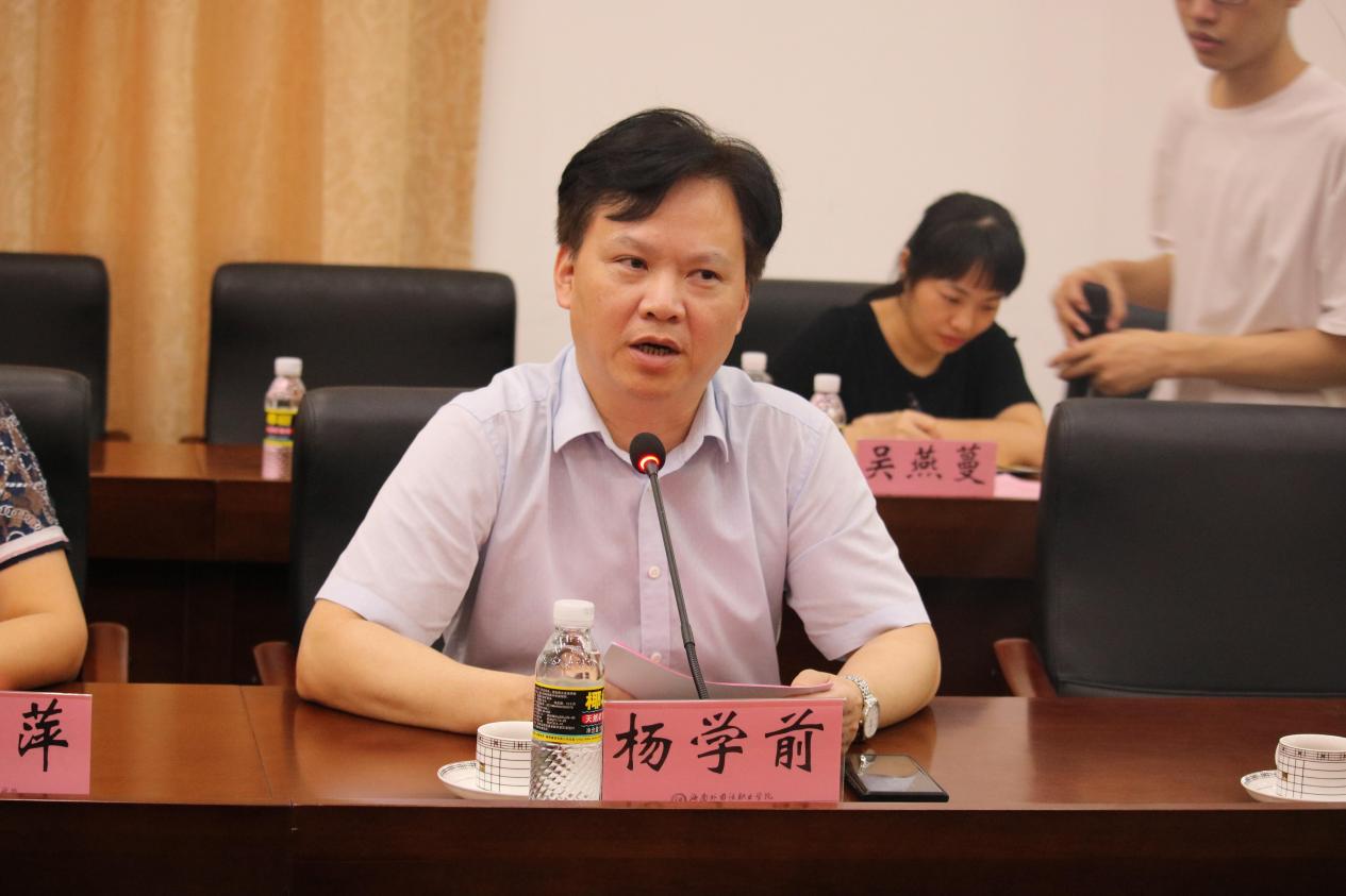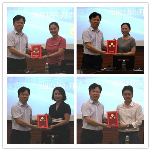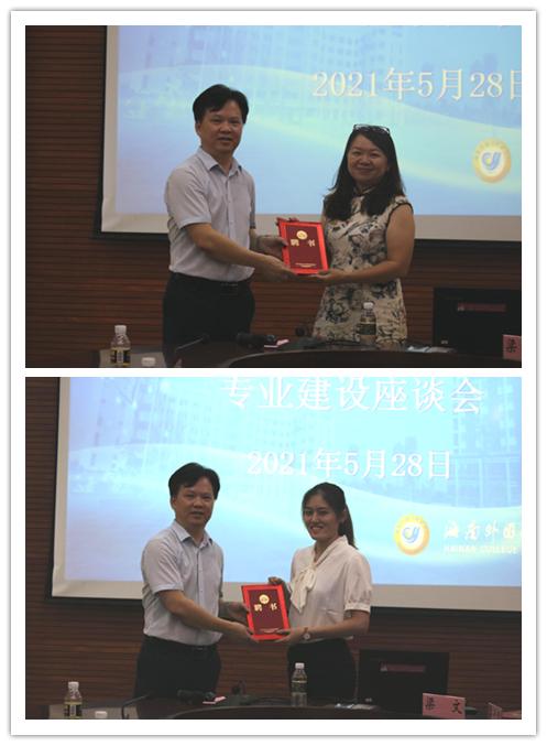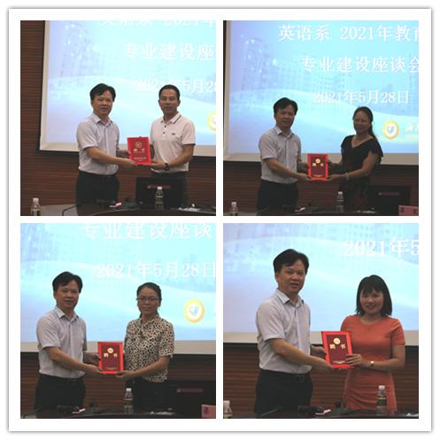 座谈会上,杨学前副院长对与会人员的到来表示了热烈的欢迎,对各单位为我院教育专业学生的教育实践工作提供良好的平台表示感谢。他指出我院将于6月中旬承办2021年全国职业技能大赛口语大赛,并希望英语系以此为契机,抓教学抓内涵建设,加强教育类学生师德教育、思政教育,继续发扬我院40多年的英语教育老牌专业的优良传统,为海南自贸港建设继续培养出一批又一批德智体美劳全面发展的教育人才。随后,杨学前副院长给各位与会领导颁发校外实践指导教师聘书。