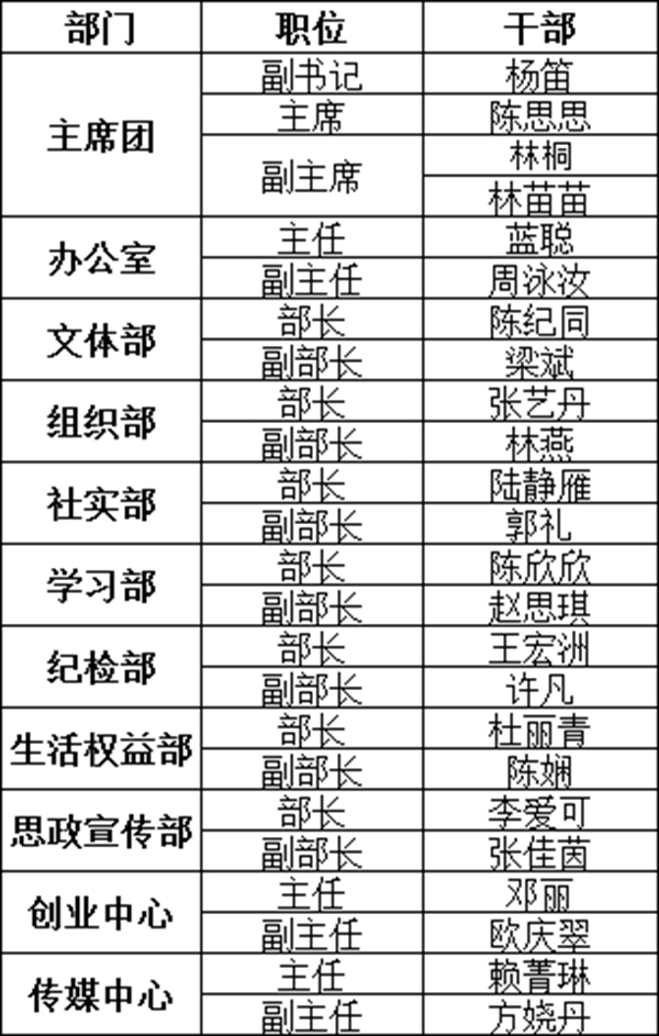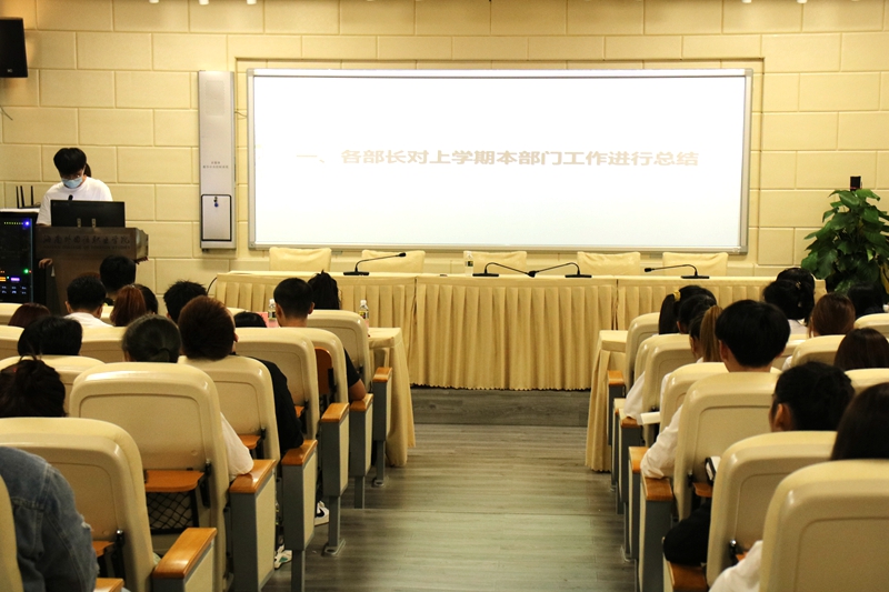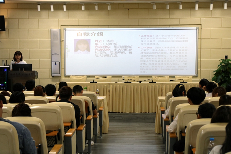 会上,各部长对上学期的工作进行总结,向到会的老师和同学们介绍了上一学期团总支学生会各项活动的开展情况。接着,新一届竞选人员上台竞演,针对于自己的工作情况总结过去、分析现在、展望未来,就各自的以往工作经历、对工作岗位的认识、竞选原因以及对未来的工作设想进行了演讲。