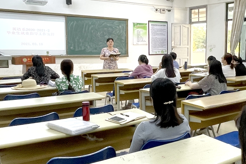 为全力抓好2021届毕业生就业工作,3月18日下午五点,英语系在AE202召开2021届毕业生就业指导会,对就业工作再强调、再部署、再推进。英语系党总支副书记吴清晖、副主任张清萍、毕业班辅导员和全体实习指导老师参加会议。会议由英语系就业指导员黄健主持。