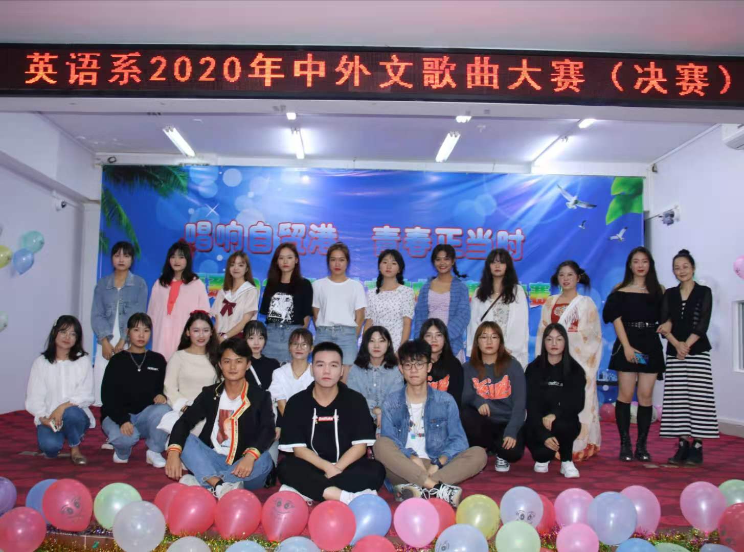 经过初赛激烈的角逐,共有20名选手晋级决赛。舞台上,选手们尽情展示自己,创造出一幅幅声色兼美的亮丽风景,也诠释了青春正当时的主题,整个比赛过程气氛热烈,激情挥洒,掌声和喝彩声经久不息,一次次将整个会场气氛推到高潮。他们用那嘹亮的歌声,唱响了海南自贸港。经过紧张的统分后进入到了颁奖环节,大赛设一等奖一名、二等奖二名、三等奖三名,由英语系金龙英老师为获奖选手颁奖,随后参赛人员全体合影留念。