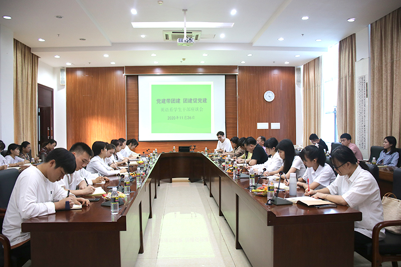 2020年11月26日下午,英语系在七楼第二会议室召开“党建带团建,团建促党建”学生干部座谈会,学校党委副书记黄丽芹、学生处处长符兴宝、英语党总支副书记吴清晖、副主任张清萍、全体辅导员、各教研室主任及17名学生干部参加了座谈会。会议由吴清晖副书记主持。