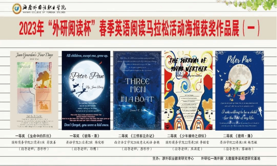 此次活动英语学院学生共提交了海报作品37份,书评作品54份。海报项目上,三位英语专业教师和两位视觉传达专业教师从主题、内容、设计、语言等因素对海报进行了综合评定。最终,21级应英2班韩宛彤的作品凭借主题突出、内容表达丰富、设计构图精美、语言表达准确等特点荣获一等奖。22级英教1班杨思敏、22级应英1班黄敏慧和叶倩男荣获二等奖;21级应英3班吴思雨、21级应英2班魏家芬、22级英教1班周笑含、黄莉和许轩荣获三等奖;谢慧雯等12位同学获得优秀奖。