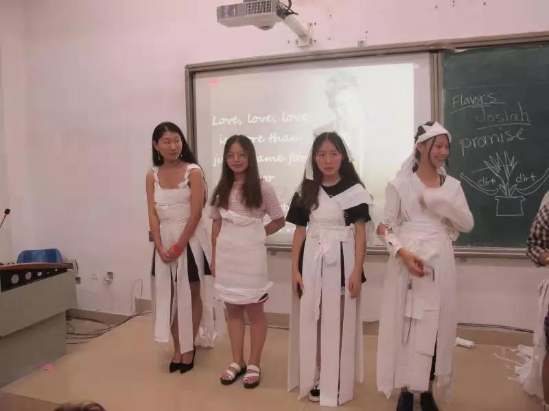 当然同学们不仅品尝了关于浪漫的蛋糕,还一起玩了关于浪漫的小游戏。例如男生扮演新郎进行系领带比赛和女生扮演新娘参加卷纸婚纱设计比赛。通过游戏同学们不仅了解到了美国婚礼文化,也现场操练了相关的词汇,句子和婚礼誓言等等,收获满满。