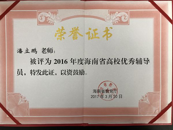 此次评选活动,是海南省教育厅根据《海南省普通高等学校辅导员管理办法》和《关于举办“第九届全国高校辅导员年度人物”评选活动的通知》有关精神,经各高校严格按照标准评选推荐候选人、省教育厅组成专家评选小组评选、公示等程序评选出来的,共评出包括我系辅导员潘立鹏在内的10名2016年度“海南省高校优秀辅导员”。