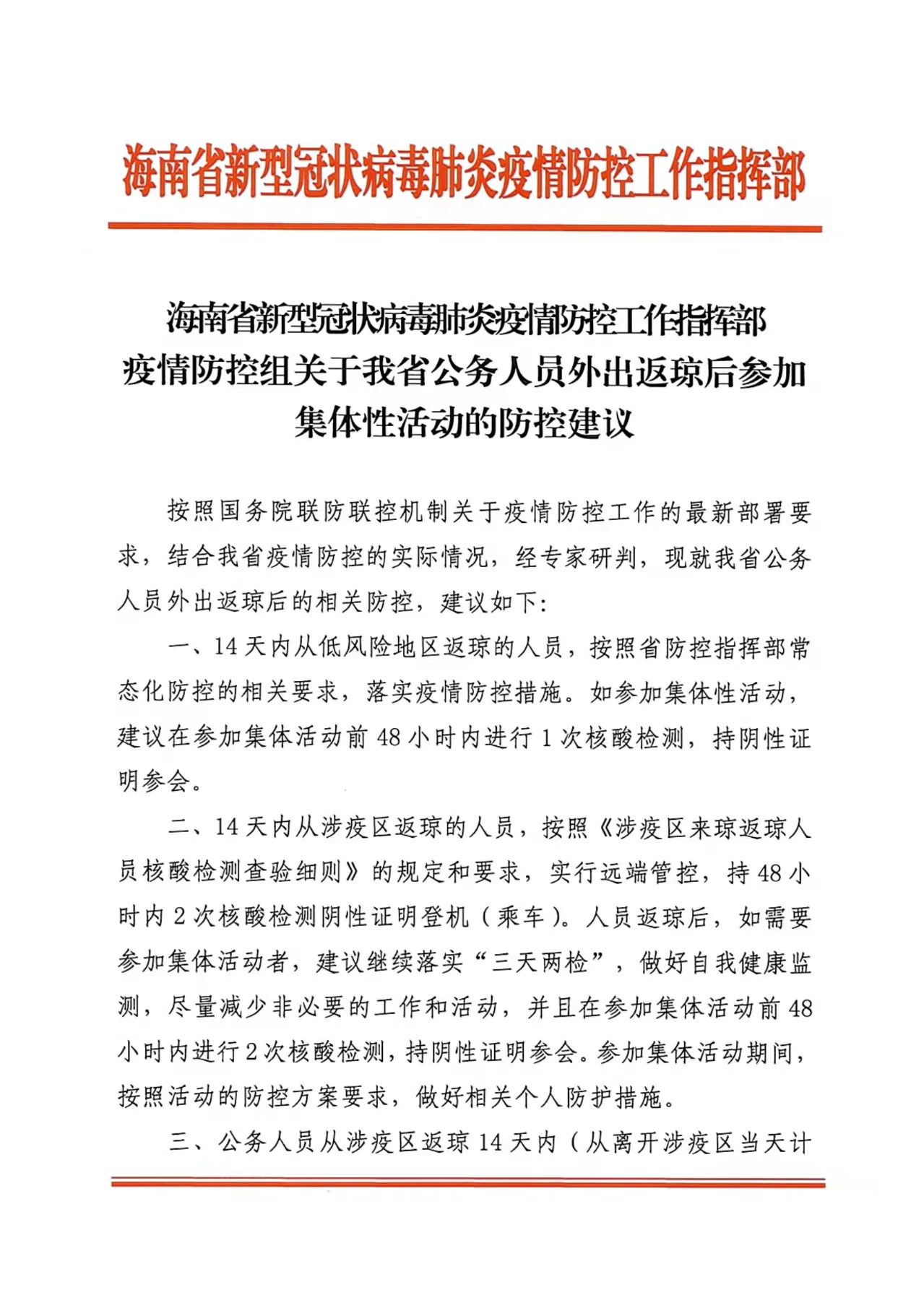 beat365官方网站关于海南省新冠状病毒肺炎疫情防控工作指挥部关于我省公务人员外出返琼后参加集体性活动的防控建议