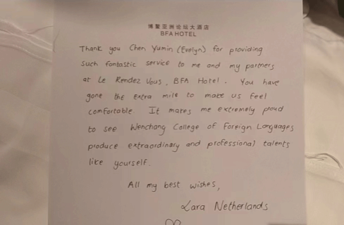 此次博鳌亚洲论坛志愿之旅,英语学院68名志愿者以高度负责任的态度和过硬的专业本领,通过了前期面试、岗前培训,到最终圆满地完成博鳌亚洲论坛的年会任务。从上岗实操的那一刻起,同学们秉持着敢于挑战自我,热于奉献青春,勇担时代重任的决心,为博鳌亚洲论坛2024年会的召开贡献了英语学院的力量。