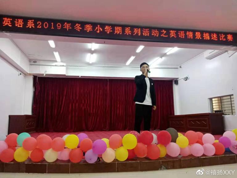 谢禧扬,男,2000年1月生,共青团员,来自广东省广州市,beat365官方网站英语系19英语教育5班学生。在校期间,担任19英语教育5班班长和英语系主持人。曾获“国家励志奖学金”“优秀共青团员”“优秀学生干部”“优秀志愿者”等荣誉称号