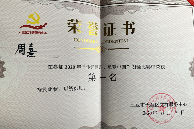 2020年11月参加三亚市天涯区党群服务中心朗诵比赛荣获一等奖。