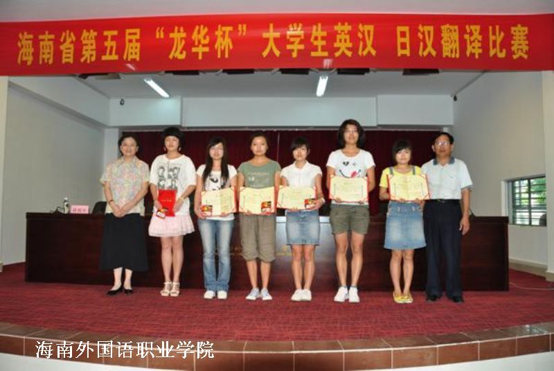 我系学生刘娅(左四)、杨欢(右二)荣获海南省第五届英汉翻译比赛一等奖