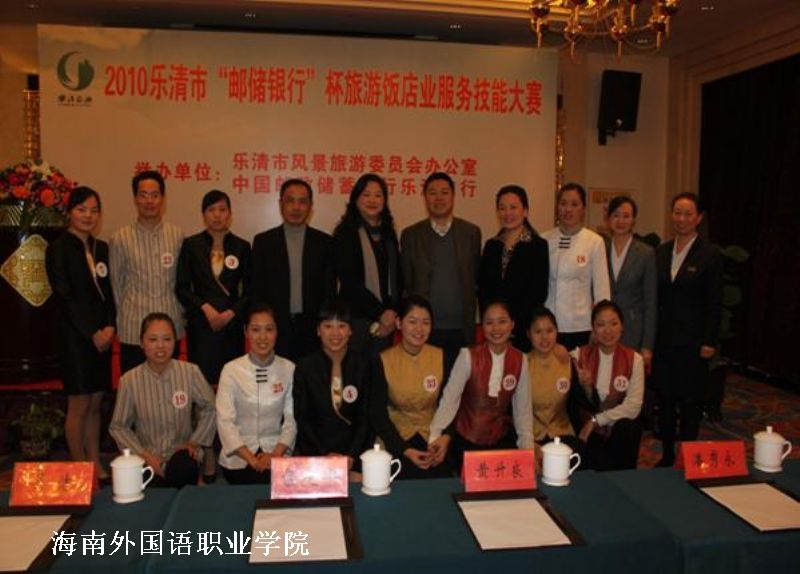 我系顶岗实习生3名前厅参赛选手参加旅游酒店业服务技能大赛囊括前三甲:09涉外酒店1班学生王涛(前排左三)荣获第一名,魏俊杰(后排左一)龚景(后排左三)分别获第二、第三名