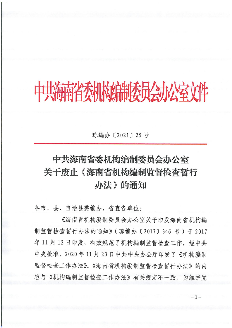 中共海南省委机构编制委员会办公室关于废止《海南省机构编制监督检查暂行